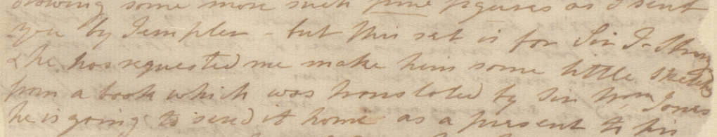 I have been very busy drawing some more such fine figures as I sent you by [William] Templer, but this set is for Sir T[homas] Strange, and he has requested me make him some little sketches from a book which was translated by Sir William Jones. He is going to send it home as a present to his sister in law, and this I have had the presumption to undertake.