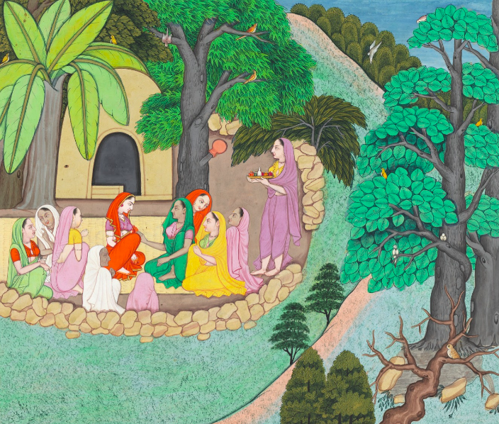 Another series of mid-eighteenth-century illustrations held at the National Museum depicts numerous scenes from the Śakuntalā. In the image below, painted in the Pahari style in Nalagarh, Priyamvada brings a tray of cosmetics to adorn Shakuntala: