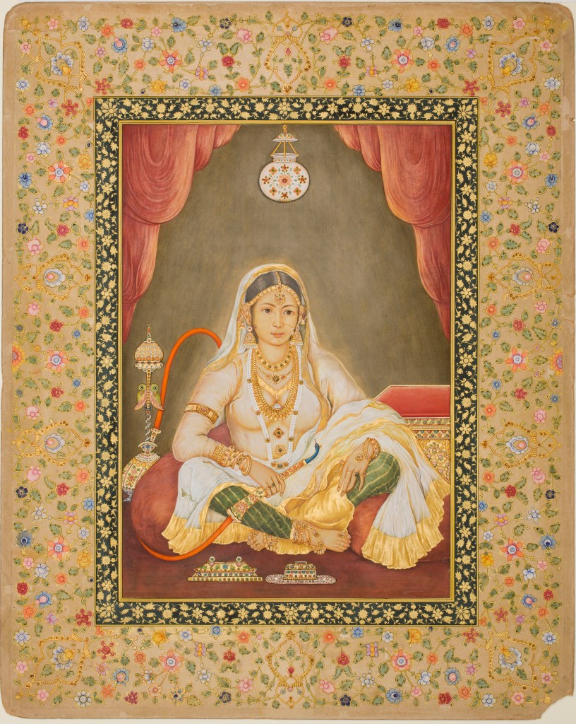 These paintings, however, postdate Symonds’s watercolour; while Symonds may have produced an image anticipating this trend, her points of reference must be earlier. Perhaps the most significant store of British or European-style paintings of Indian women, if not shown exclusively at their toilette, arose from the late eighteenth- and early nineteenth-century trend of painting the women referred to as bibis, the ‘wives’ or companions of British men in India. Mildred Archer stated in her 1979 India and British Portraiture, 1770–1825 that, towards the end of the late eighteenth century, “many of the older Company servants still lived settled lives with unofficial Indian wives or bibis,” following the reasoning that the number of English women in India was ‘insufficient’ and that it was too expensive to marry and “maintain in India in relative comfort” an English woman. Bibis thus entered into the artistic record. In Picturing Imperial Power, Beth Fowkes Tobin states that “some of the paintings of bibis as the common-law wives of British men belong to the genre of portraits of favorite mistresses; other paintings of bibis, husbands, their children, and extended families are family conversation pieces, much like [Johan] Zoffany’s The Family of Sir William Young” (23). Hermionede de Almeida and George H. Gilpin, in Indian Renaissance: British Romantic Art and the Prospect of India, emphasize the difference between the genre conventions of the bibi portrait and the portrait of the English noble: while the latter genre portrayed its subjects as “stiff” and “upright,” portraits of bibis were, conversely, “sensual,” with sitters often shown wearing jewelry, with a hookah, reclining, and barefoot. Tobin, however, argues these paintings presented an appealing alternative to “British bourgeois notions of domesticity… [and] femininity” (117).