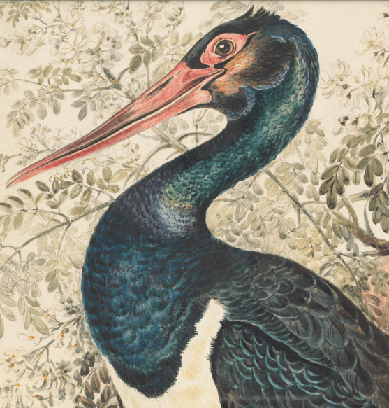 The most consistent trait in Gwillim’s birds is her depiction and placement of their feathers in such a way that shows an unprecedented understanding of avian anatomy. This is a subfield of ornithology called pterylography: the descriptive science of plumage, the arrangement of the feather tracts on the birds skin. Pterylography attends to how feathers specifically overlap on the birds to cover bare, flexible skin (since birds are not fully covered in feathers), which varies greatly and is species-specific. Gwillim’s affinity for this very specific visual detail was noted by Canadian ornithologist and artist Terrence Shortt, who claimed in an exhibition catalogue on her work that “no artist before 1800 had demonstrated the kind of intimate understanding of pterylography that is revealed in the Gwillim birds.”