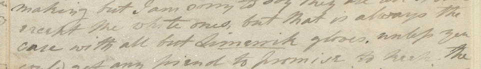 …let us have […] 6 pair for each of us of white kid gloves and 12 pairs each of the finest Limerick gloves of a light yellow colour… or instead of the Limerick some pairs of fine soft yellowish grain kid. These carry and keep best; the browns spot and spoil, sadly, and do not wear at all well in the heat.