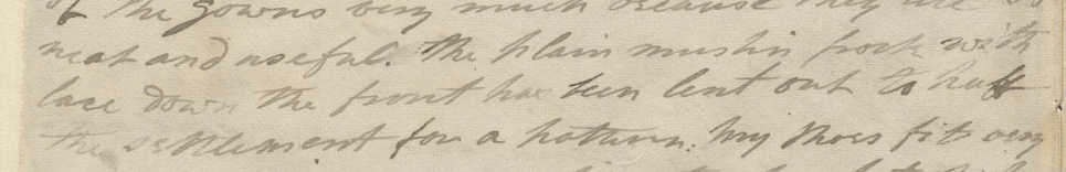 In addition to their suitability for Elizabeth and Mary’s geographic circumstances, then, Limerick gloves served the sisters’ interest in fashion. From their letters, we know that the sisters were committed to dressing well and in keeping with current fashions: Elizabeth, in 1803, professed “a desire for a variety and fashion” and––finding that desire, at least temporarily, fulfilled––stated that she and Mary “are quite fashionable.” Both sisters wrote frequently to Hetty of clothing and accessories, commenting on what items had come into fashion, thanking her for the clothing sent over from England, and specifying their further needs and desires. In 1802, after requesting that Hetty send flowers, fancy feathers, shoes, and gloves, Mary asked that the relevant literature be sent, too, ensuring that the sisters would be privy to the current knowledge on how to deploy their new accessories: “Don’t forget the Magazine of the fashions, that we may see how to put them on.” It also appears that, in Madras, their style was much admired: in 1803, Mary praised Hetty’s good taste in the gowns she had sent from England, noting that “the plain muslin frock with lace down the front has been lent out to half the settlement for a pattern.”