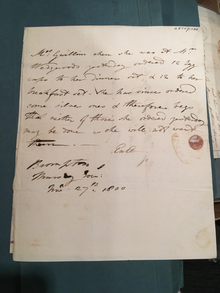 The next day she cancelled her order for eggcups. Her letter is preserved in The Wedgwood Museum Archives.