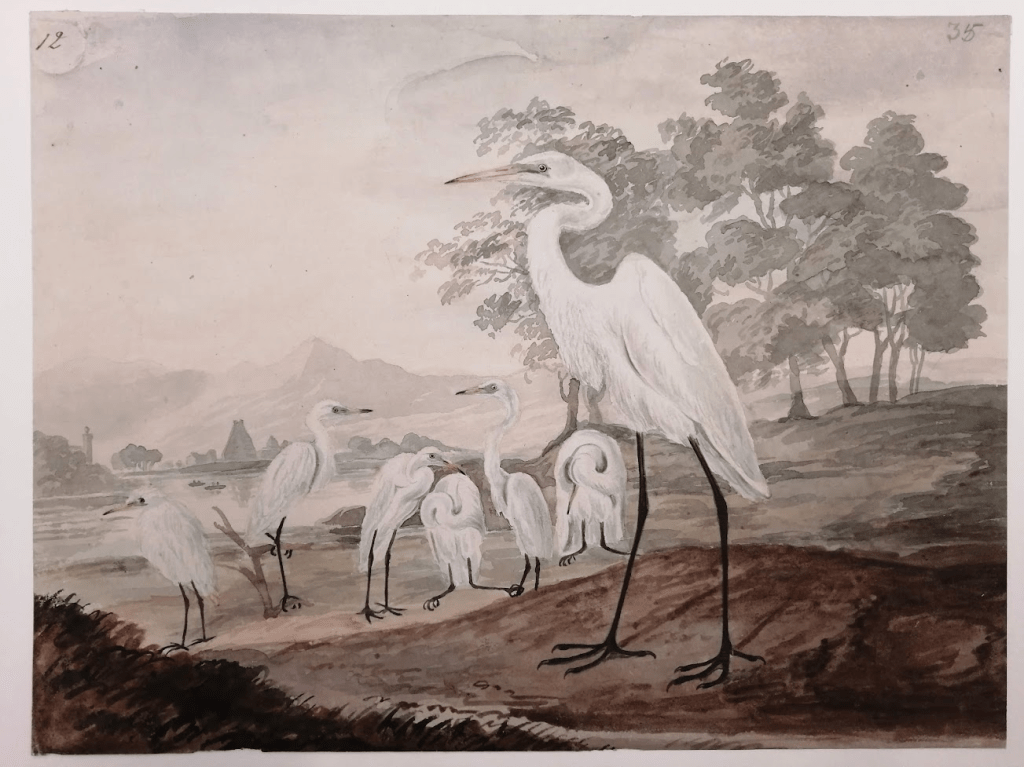 Elizabeth’s painting of a flock of an Intermediate Egret, who thrive on the shallow waters, can also be read as watercolour of a Hindu village situated at the foot of hills on the far shores of a lake with its rising gopurams.