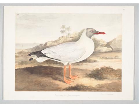 I have taken liberty to put together side-by-side two paintings by Lady Gwillim, one of a Caspian Tern (CA RBD Gwillim-1-071) on the left and a Brown-headed Gull (CA RBD Gwillim-1-021) on the right. Together their backgrounds seem to cover the entire countryside from the seashore to the hills and the space in-between. They include a tall ship in distance, coastal vegetation of palm trees, clumps of thick tropical foliage, some architectural ruins, rivers, and lakes and distant hills.