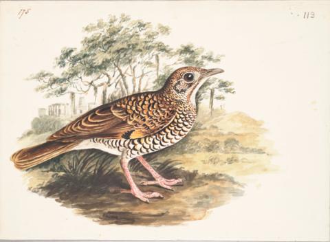 For instance, behind the Nilgiri Thrush surrounded by jungle foliage are ruins and a soaring gopuram.