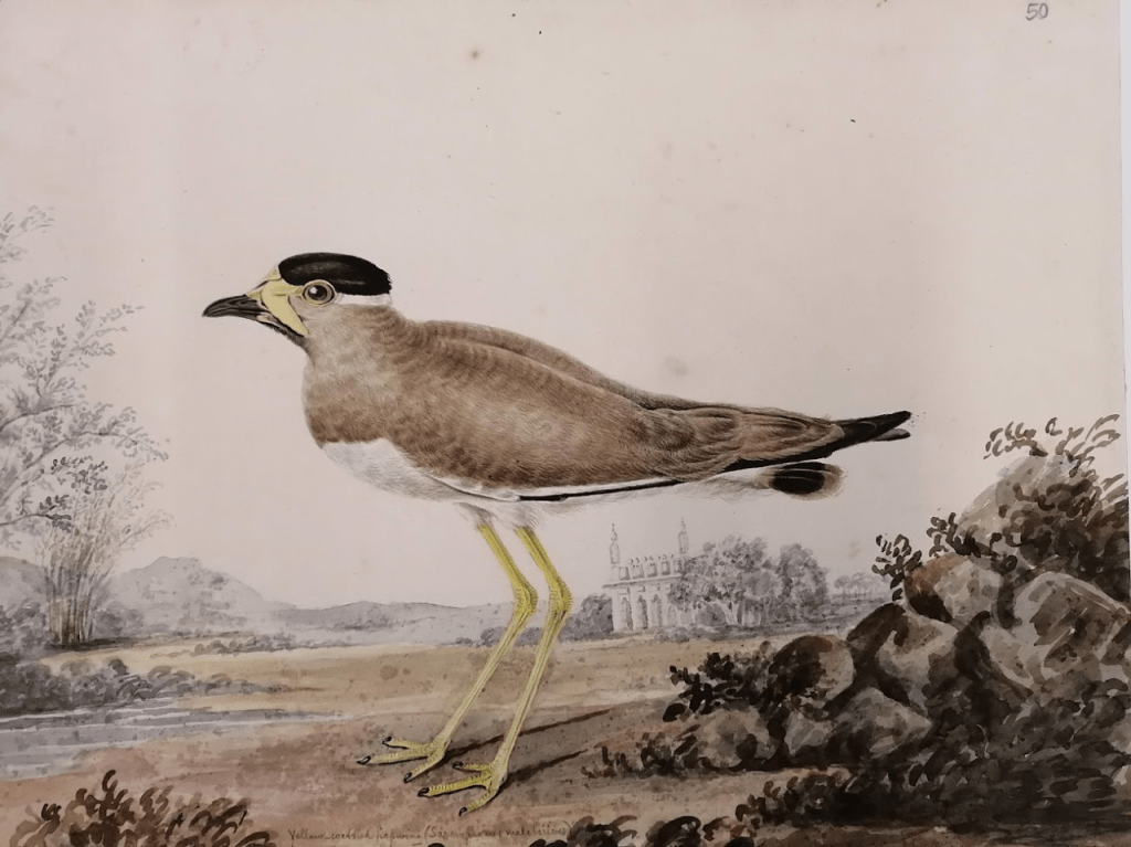 In the background of the Yellow-wattled Lapwing is a mosque, perhaps with minarets, painted with the lightest of brush strokes and watercolour washes.