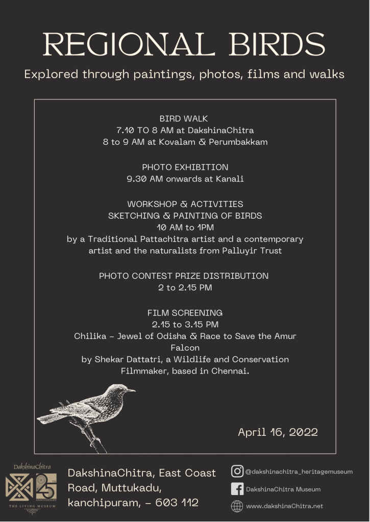 The event “Regional Birds: Explored through paintings, photos, films and walks” took place at Dakshina Chitra Museum on April 16, 2022. This event was organized by Sharath Nambiar and included a bird walk, a film, a photography competition, and artists’ workshops.