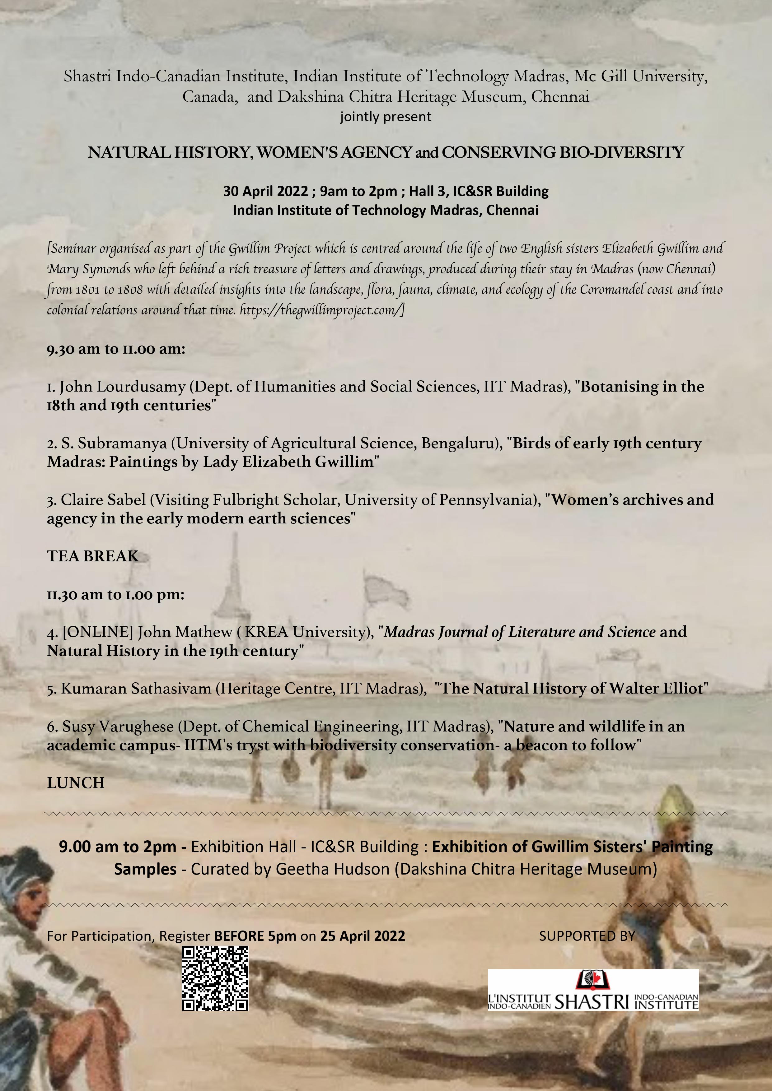 A symposium was held at the Indian Institute of Technology Madras (IIT Madras) on April 30, 2022, organised and hosted by John Lourdusamy. This event featured talks by John Lourdusamy (IIT Madras), S. Subramanya (UAS, Bengaluru), Claire Sobel (University of Pennsylvania), John Mathew (KREA University), Kumaran Sathasivan (IIT Madras), and Suzy Varughese (IIT Madras), and an exhibition curated by Geetha Hudson, Dakshina Chitra.